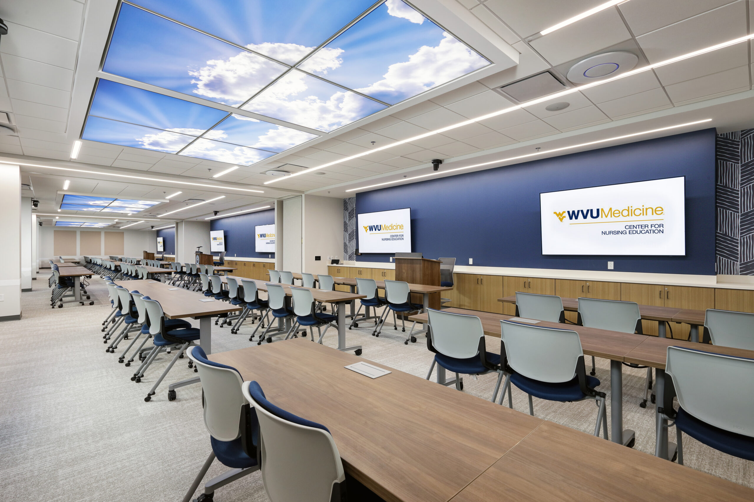 Desmone designed a 25,845 SF tenant fit-out for WVU Medicine’s Center for Nursing Education within the 1.1M SF WVU Innovation Center. Serving 250 students in an accelerated 1.5-year program, the space emphasizes hands-on learning over traditional classroom time. It features five flexible classrooms, five simulation labs with control rooms, a six-bed Skills Lab, nursing station, Hands-on Lab, breakout spaces, offices, lounges, a testing center, locker rooms, a meditation room, and restrooms.